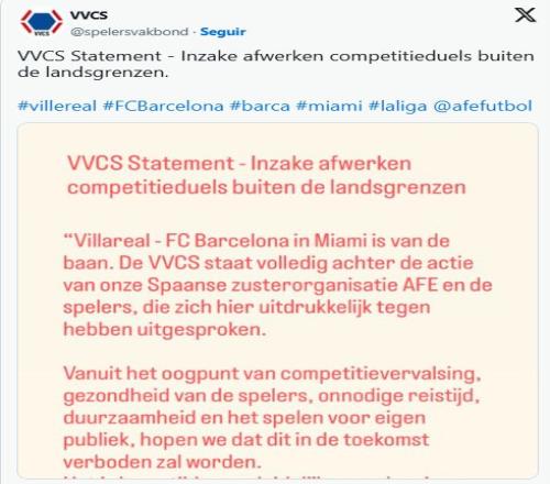 雷速体育10月23报道 此前西班牙足协提议举办黄潜vs巴萨的西甲海外联赛,在遭到多方的反对后取消,今天荷兰足球运动员联盟公开发文表示抵制。