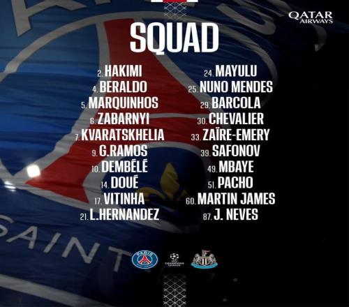 巴黎欧冠战纽卡大名单:登贝莱领衔,阿什拉夫、内维斯在列