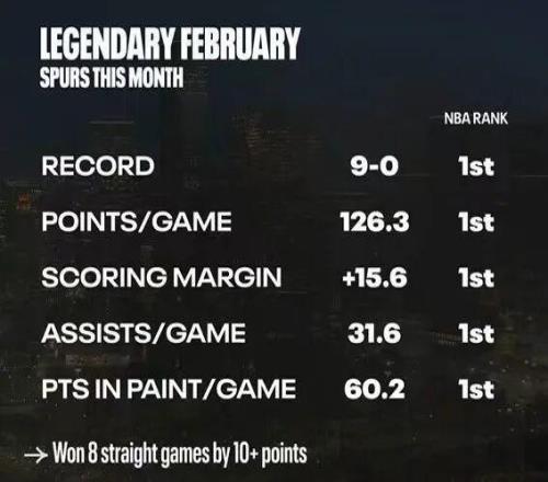 马刺当前势头极佳,今年二月份至今未尝败绩,9胜0负,并且场均得分(126.3)、场均净胜分(15.6)、场均助攻数(31.6)、场均禁区得分(60.2)均高居联盟榜首,对于他们而言一切皆有可能。