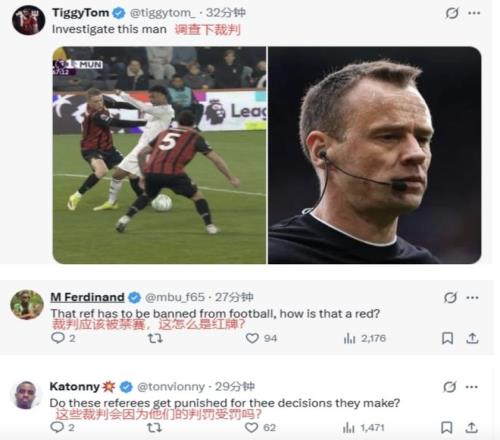 曼联球迷则在英超官方账号下面留言,表示裁判应该被禁赛,要求彻查裁判。