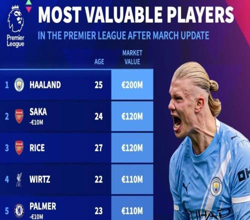 德转更新英超球员身价前10:哈兰德2亿第1,萨卡、赖斯1.2亿第2 -